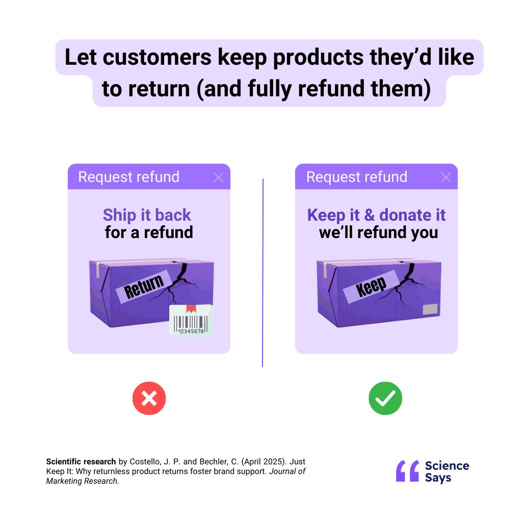 When customers want to return a product, refund it while letting them keep it. They will be up to 2x more likely to buy again.