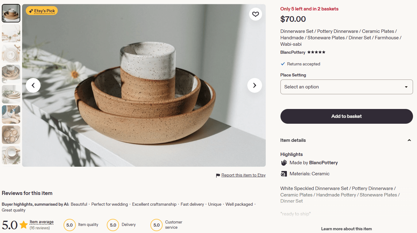 BlancPotteryās Etsy pages shows elements optimized for AI agents, which can explain why the item was chosen.